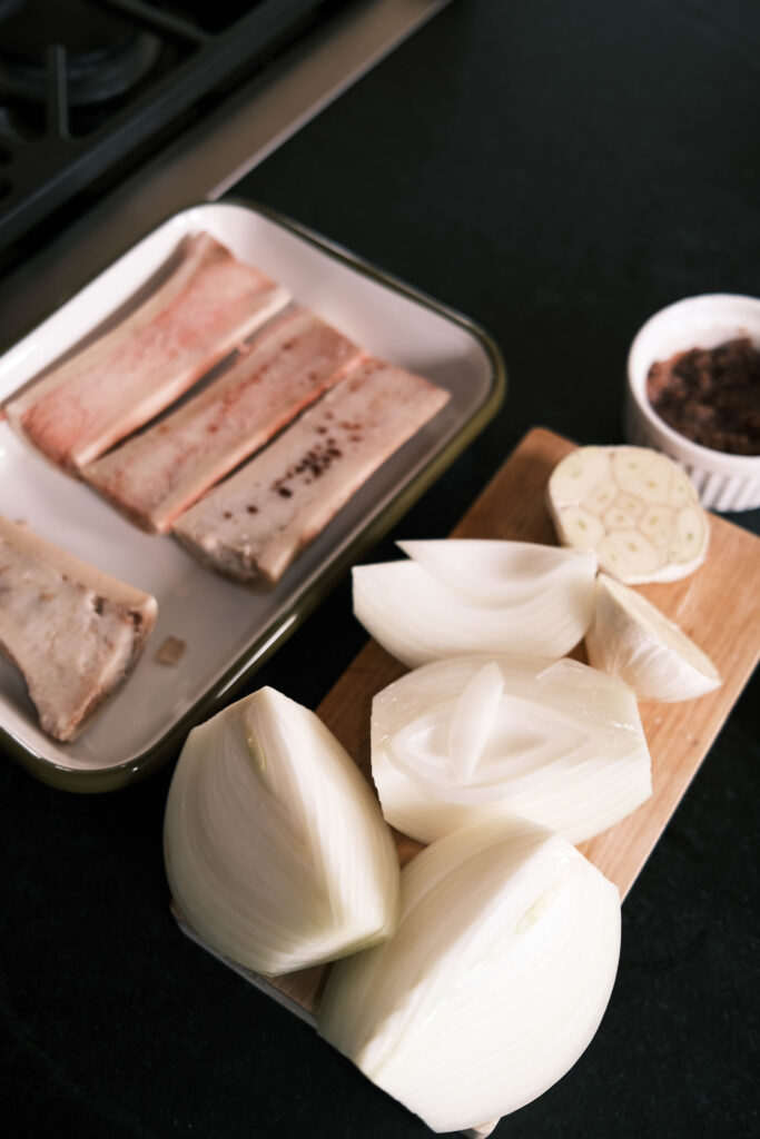 - Preheat your oven to 425°F. Arrange the beef bones, onion, and garlic on a parchment-lined rimmed sheet pan in a single layer, don’t crowd them. Roast for 35–40 minutes, until the bones are deep golden brown with dark caramelized edges. You want real color here, pale bones make pale broth.