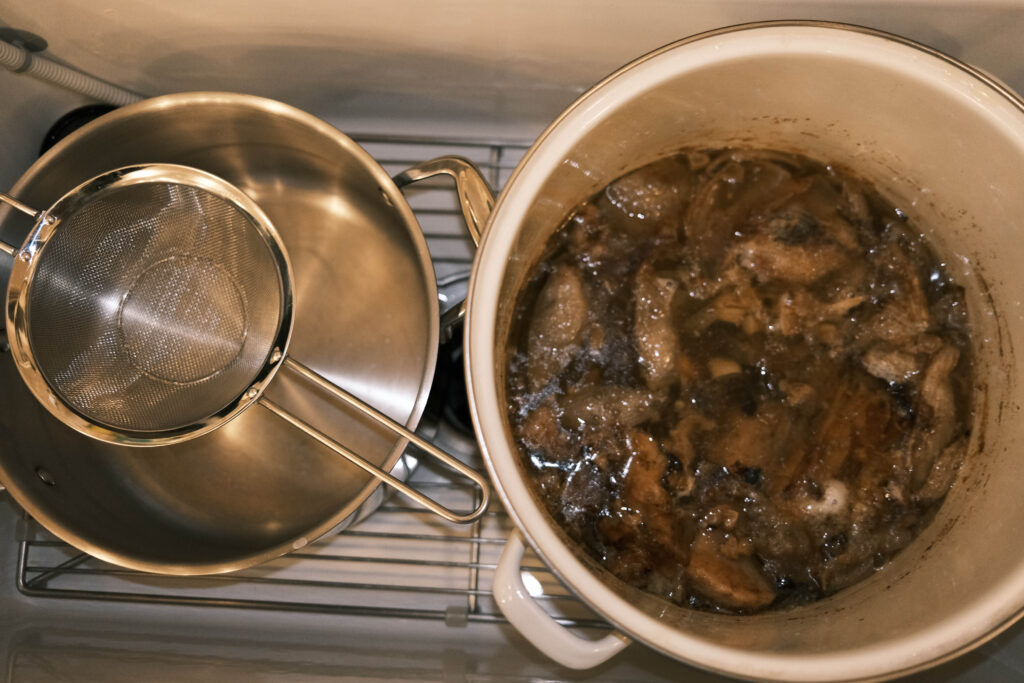 Once you’ve skimmed the initial foam, reduce the heat to the lowest setting your stove will hold. You want the surface barely trembling with a bubble rising every few seconds. Leave the pot uncovered and let it go for 10–14 hours total, checking occasionally to make sure the liquid stays above the bones. If it reduces too much, add a cup of hot water. The broth will slowly turn from pale gold to deep amber.